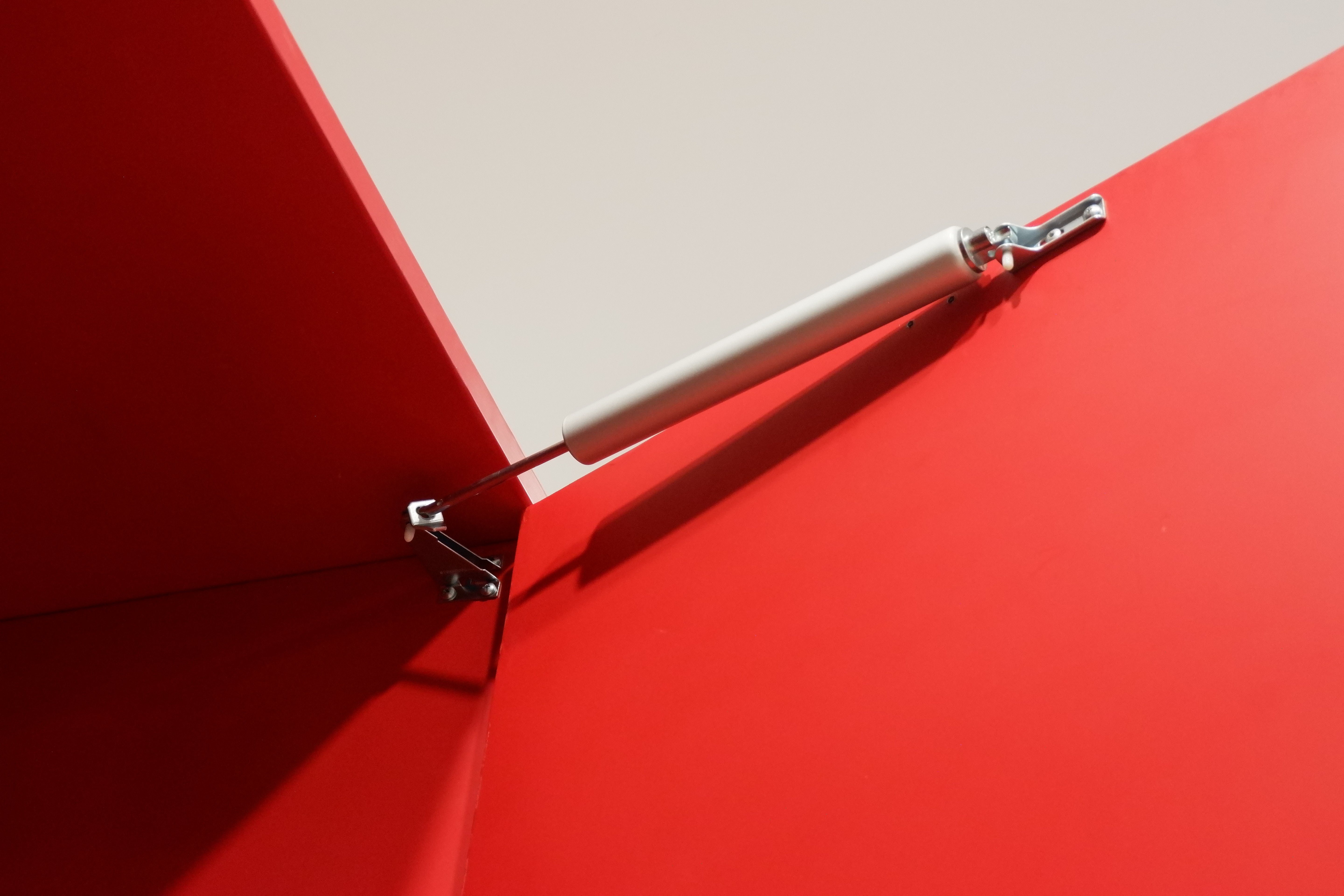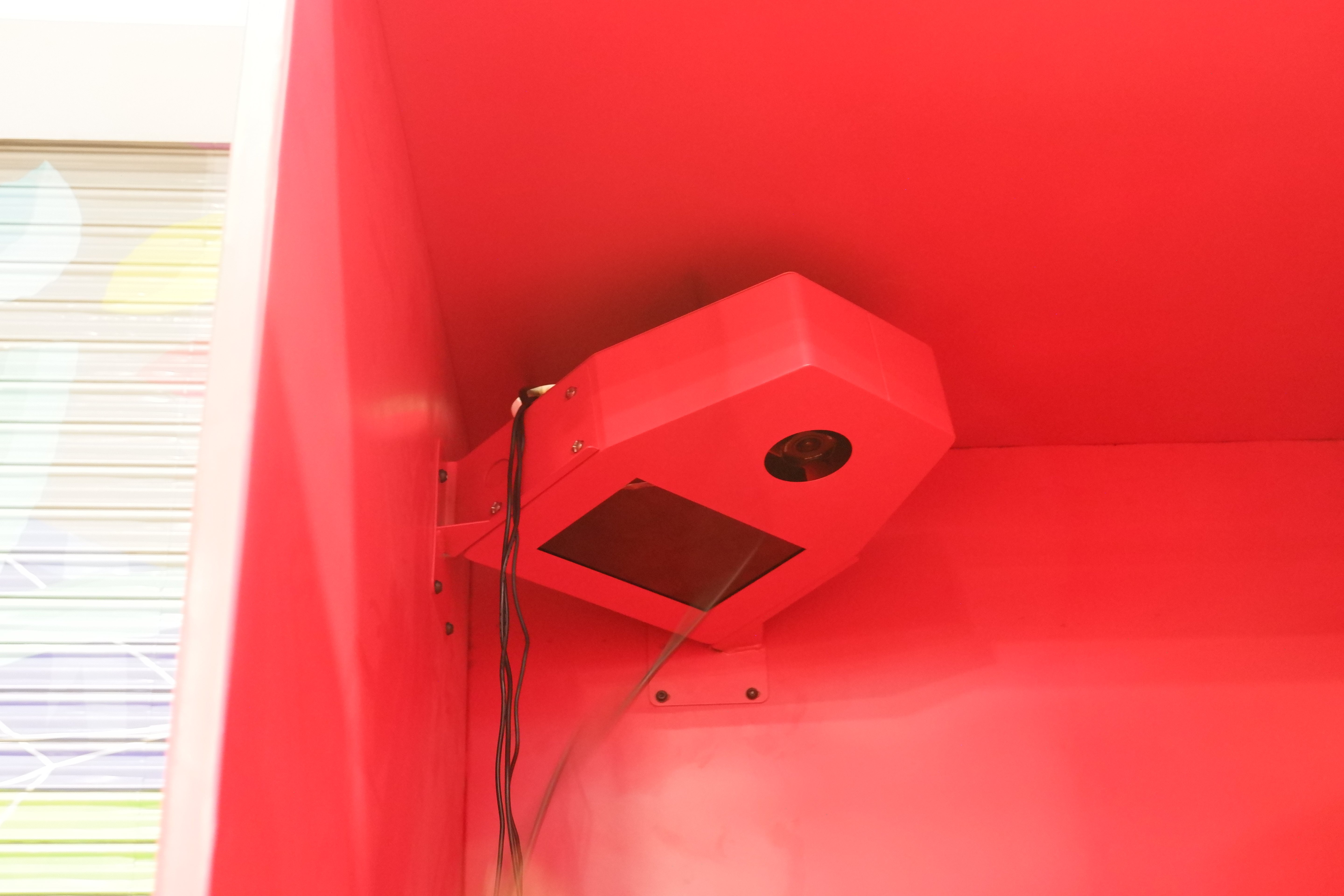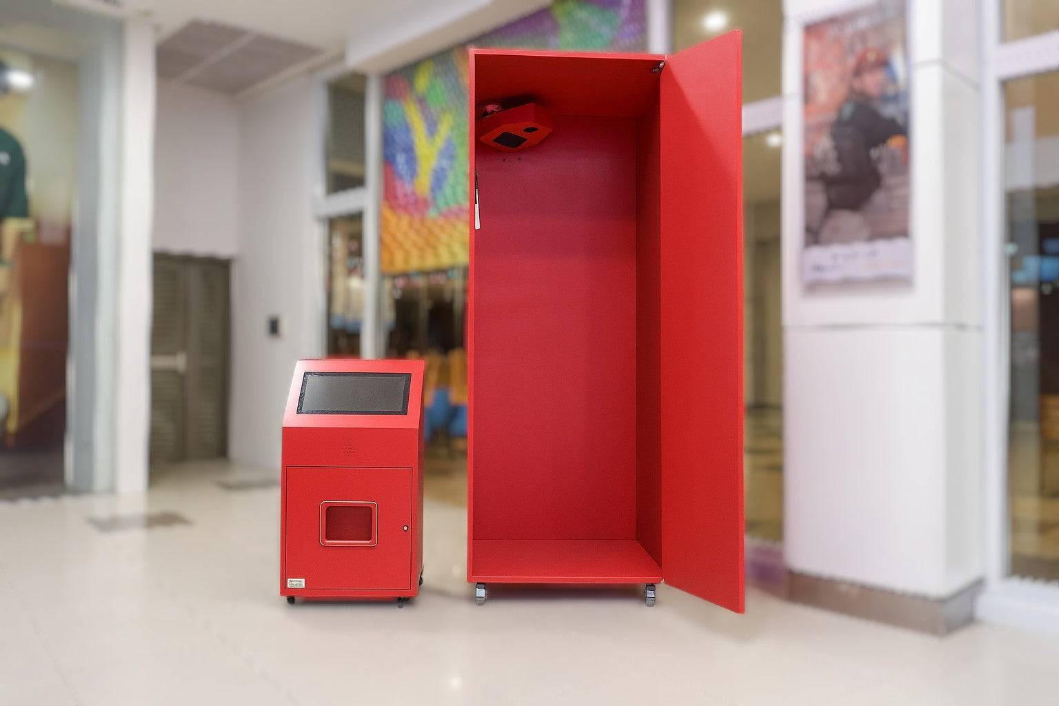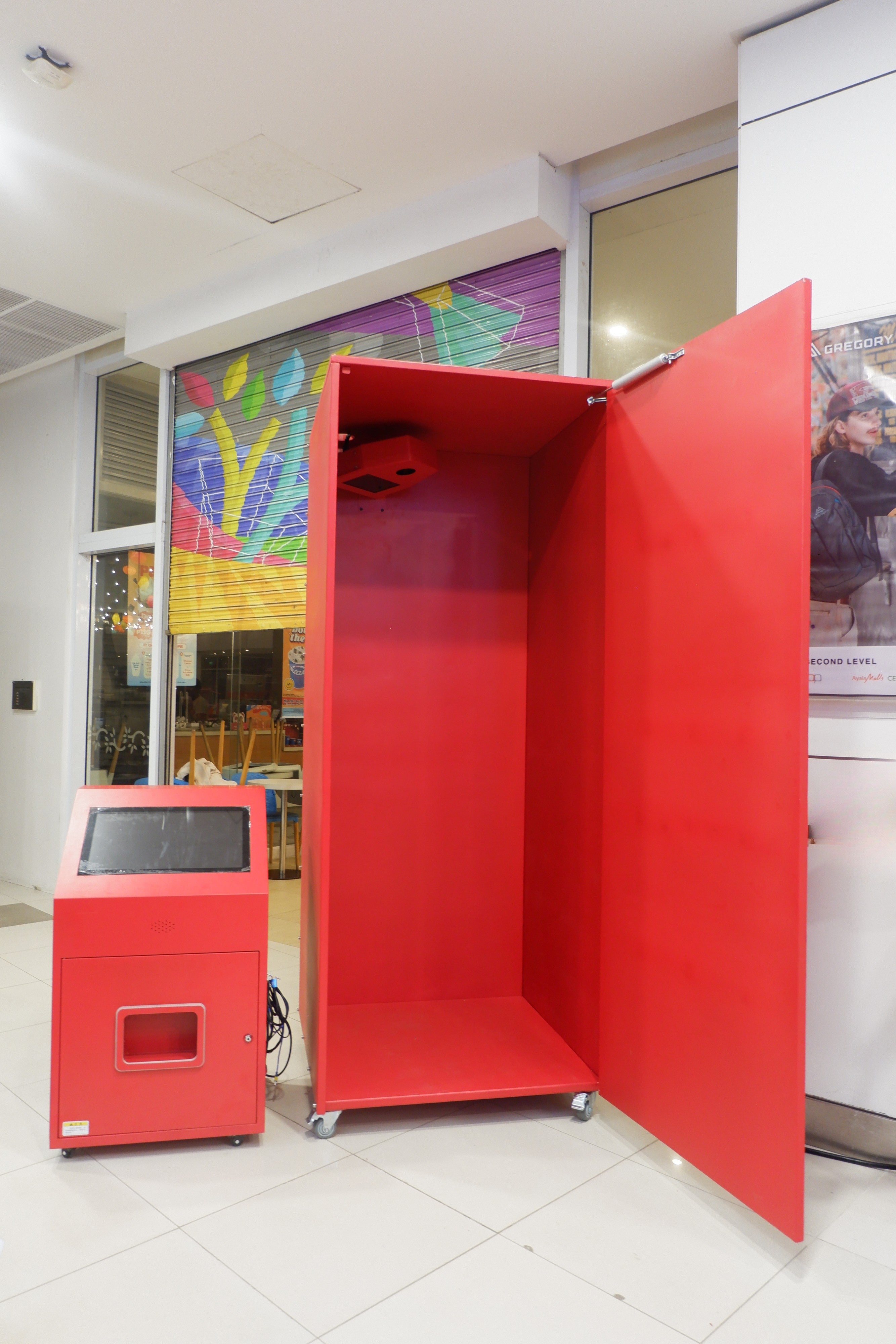 The photobooth was designed based on the client's specifications, finished in matte red automotive paint. It features a steel swing door with built-in hardware, wire management through a rear raceway, top access for camera cables, and caster wheels with front brakes for mobility. Assembly is secured using Allen bolts for stability and ease of setup.