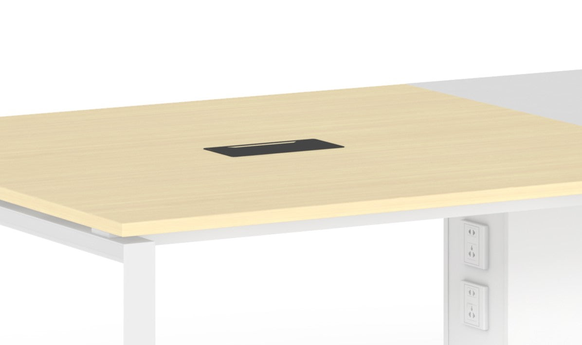 Integrated cable management and power outlet cut-outs allow for a neat and organized workspace.