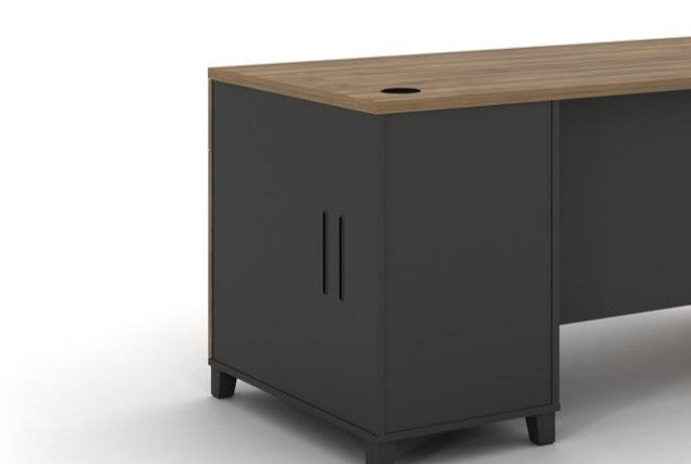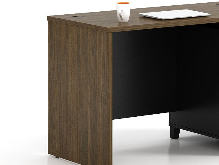 The N24 State Free-Standing Desk blends classic elegance with practical design, featuring a spacious surface, built-in storage, and a rich woodgrain finish. A bold contrasting panel adds a polished touch, making it ideal for executive or home offices that value both style and efficiency.